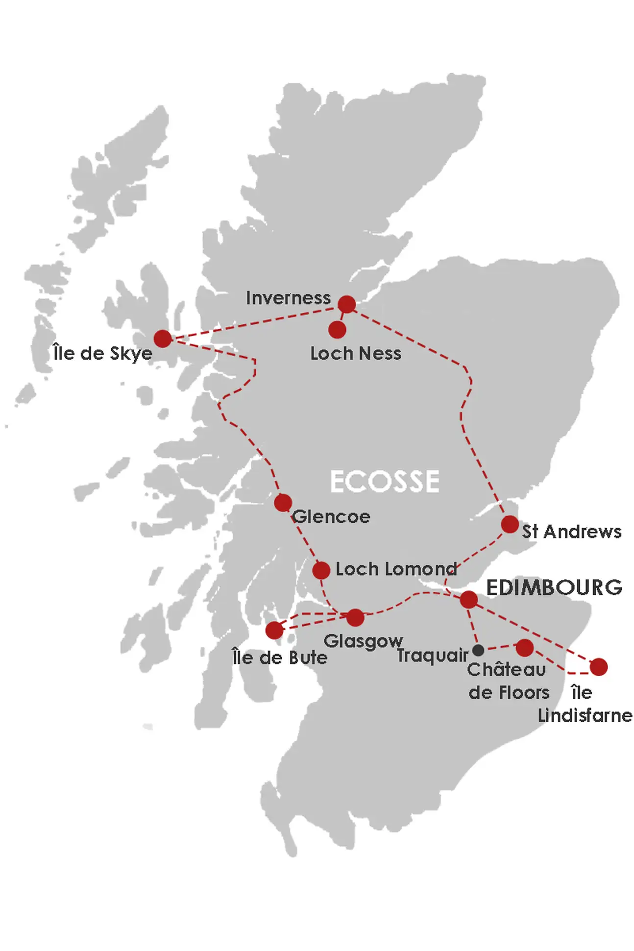 Nous avons conçu pour vous ce grand tour d’Écosse, qui vous fera découvrir les sites les plus emblématiques du pays. Vous explorerez les Highlands, les lacs mystérieux et les châteaux légendaires, tout en vous imprégnant de l’histoire et des paysages exceptionnels de l’Écosse, de l’Île de Skye aux vallées verdoyantes. Un voyage inoubliable, au cœur de la beauté écossaise.