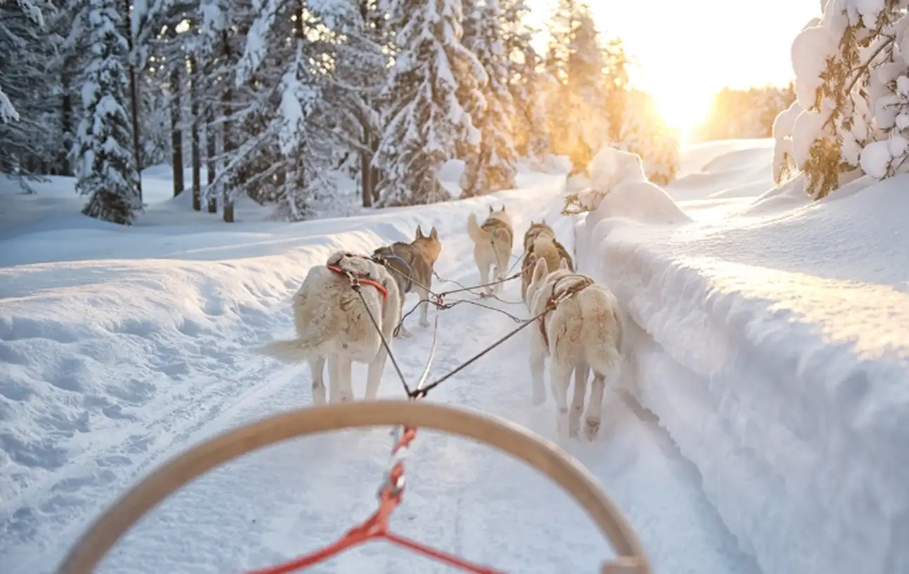 • Safari en chiens de traîneau à travers forêts boréales et lacs gelés