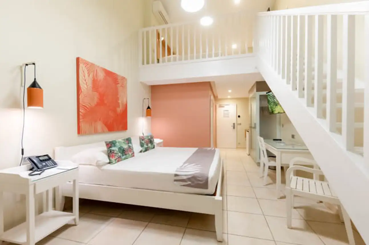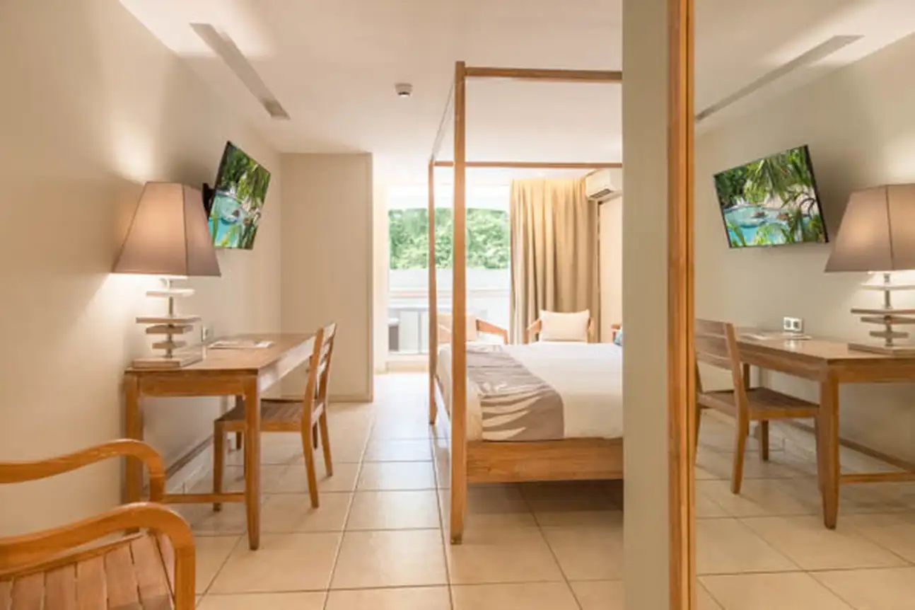 - Suite Tropicale vue village (45 m²) : salle de bain avec douche et baignoire, terrasse privative de 6 m² vue village. Capacité maximum : 2 adultes.