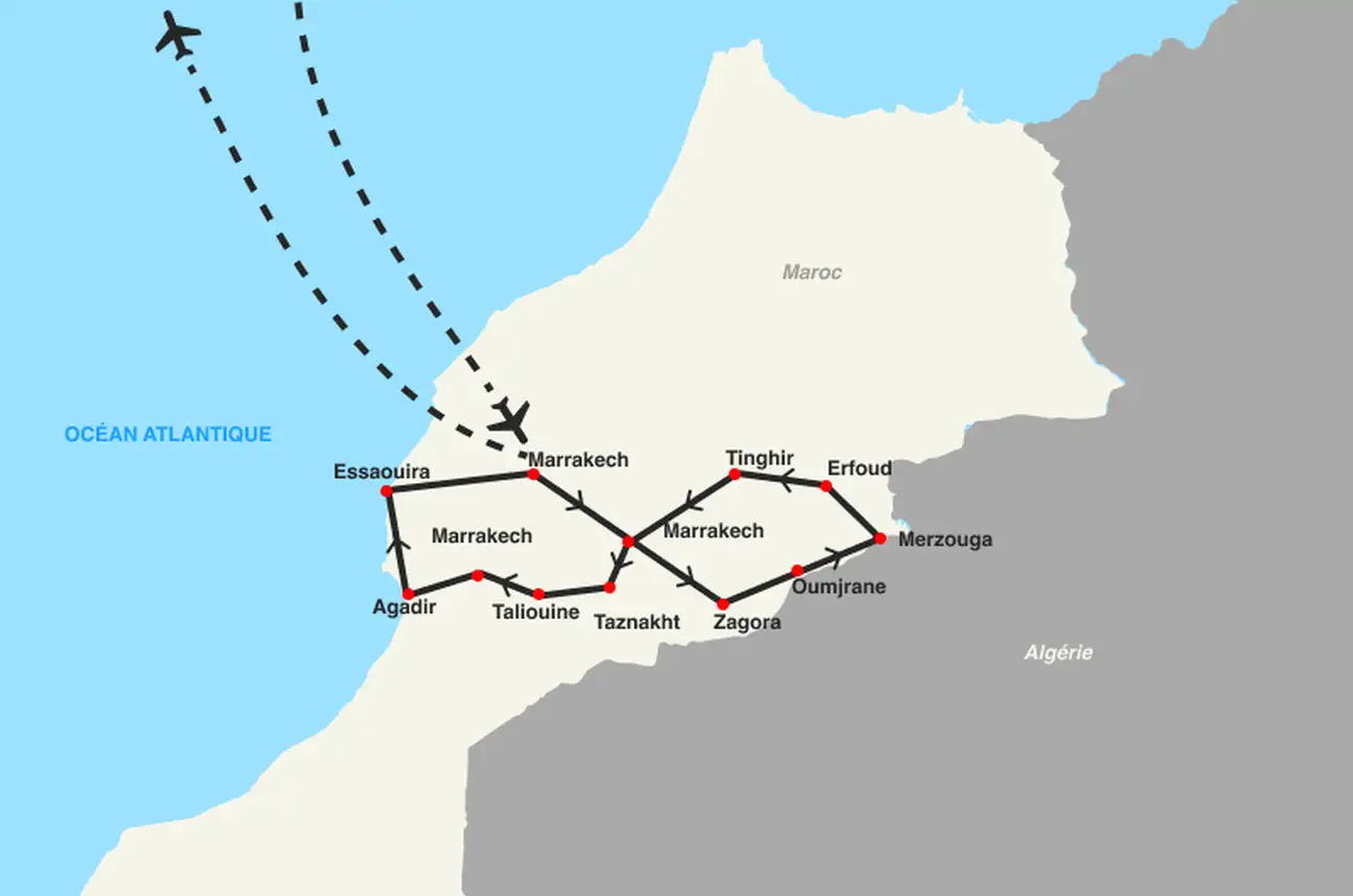 Vous passerez : 2 Nuits Marrakech + 1 Nuit Zagora + 1 Nuit Merzouga + 1 Nuit Tinghir + 1 Nuit Agadir + 1 Nuit Marrakech