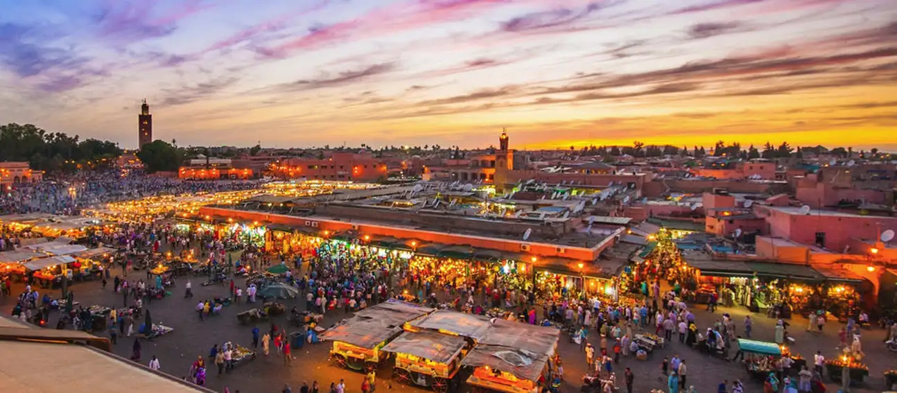 Journée consacrée à la visite de Marrakech, ancienne ville impériale fondée en 1062. Vous découvrirez la majestueuse silhouette de la Koutoubia qui domine les maisons rouges, la MEDERSSA. Déjeuner en médina. Continuation par la place Jemaa el Fna, cœur vivant de la ville, le souk des teinturiers, du cuir en passant par celui des épices. Dîner et nuit à l’hôtel.