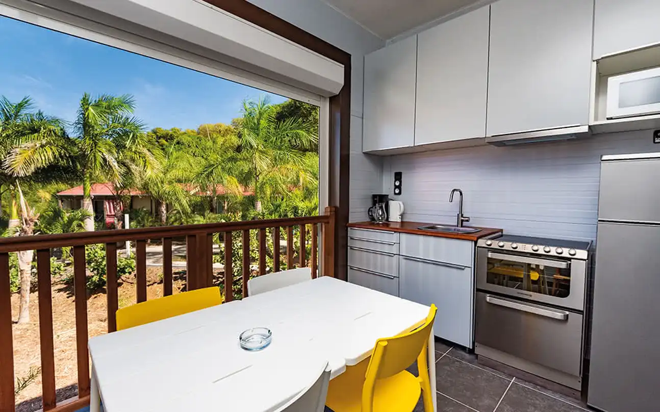 Équipement : 1 pièce à vivre d'environ 16m² avec 1 lit double 160x200 cm + 1 lit superposé (90x180 cm), rangements. Terrasse couverte d'environ 9 m² avec cuisine aménagée, 1 table et 4 chaises, 4 plaques de cuisson, lave-vaisselle, four, micro-onde, bouilloire, cafetière, réfrigérateur , ustensiles de cuisine et couverts.